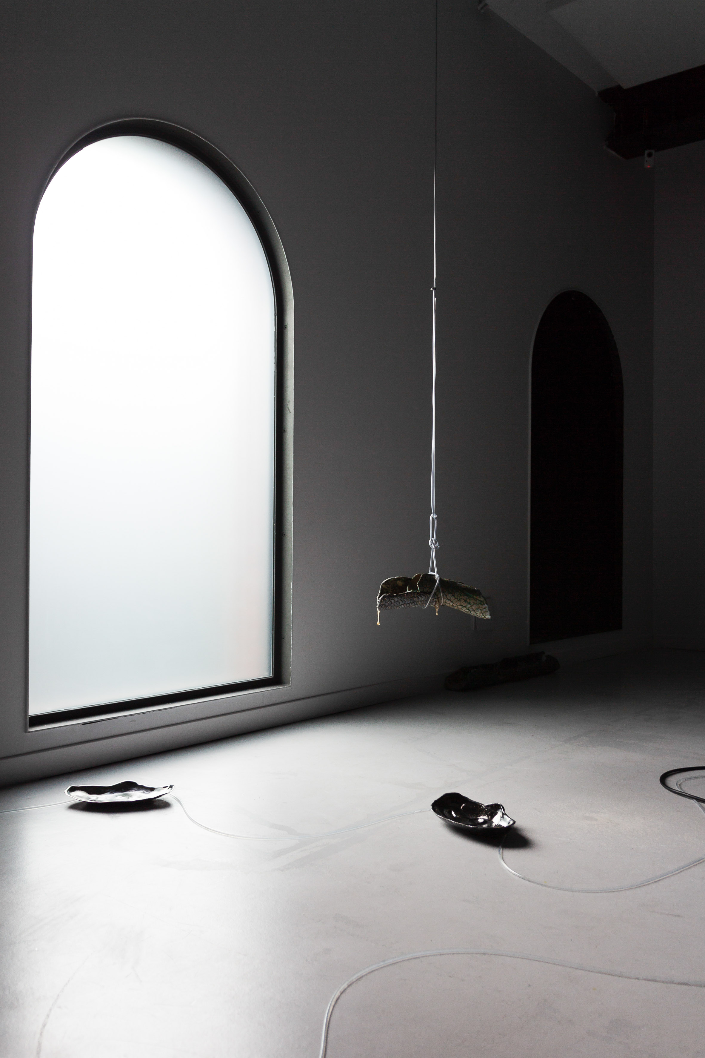 Inside the exhibition, both water and night become a place for intuition, a place where bodies are in fluid relation with nature and technology. Basque mythology, history of art and contemporary culture are used by the artist as references for excavating and foreseeing an interconnected net of relations, made of encounters and collisions that are affecting our individual and social body.