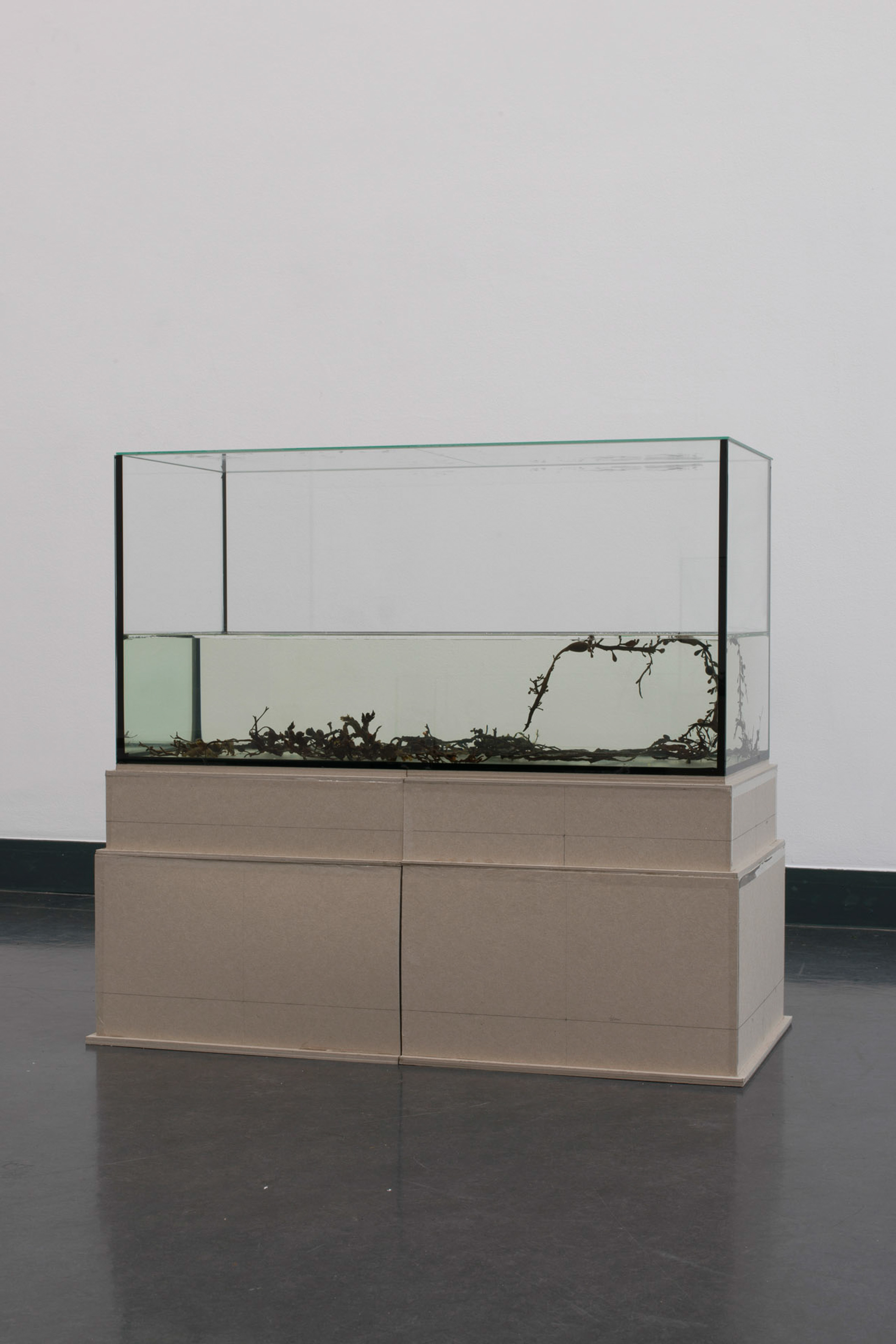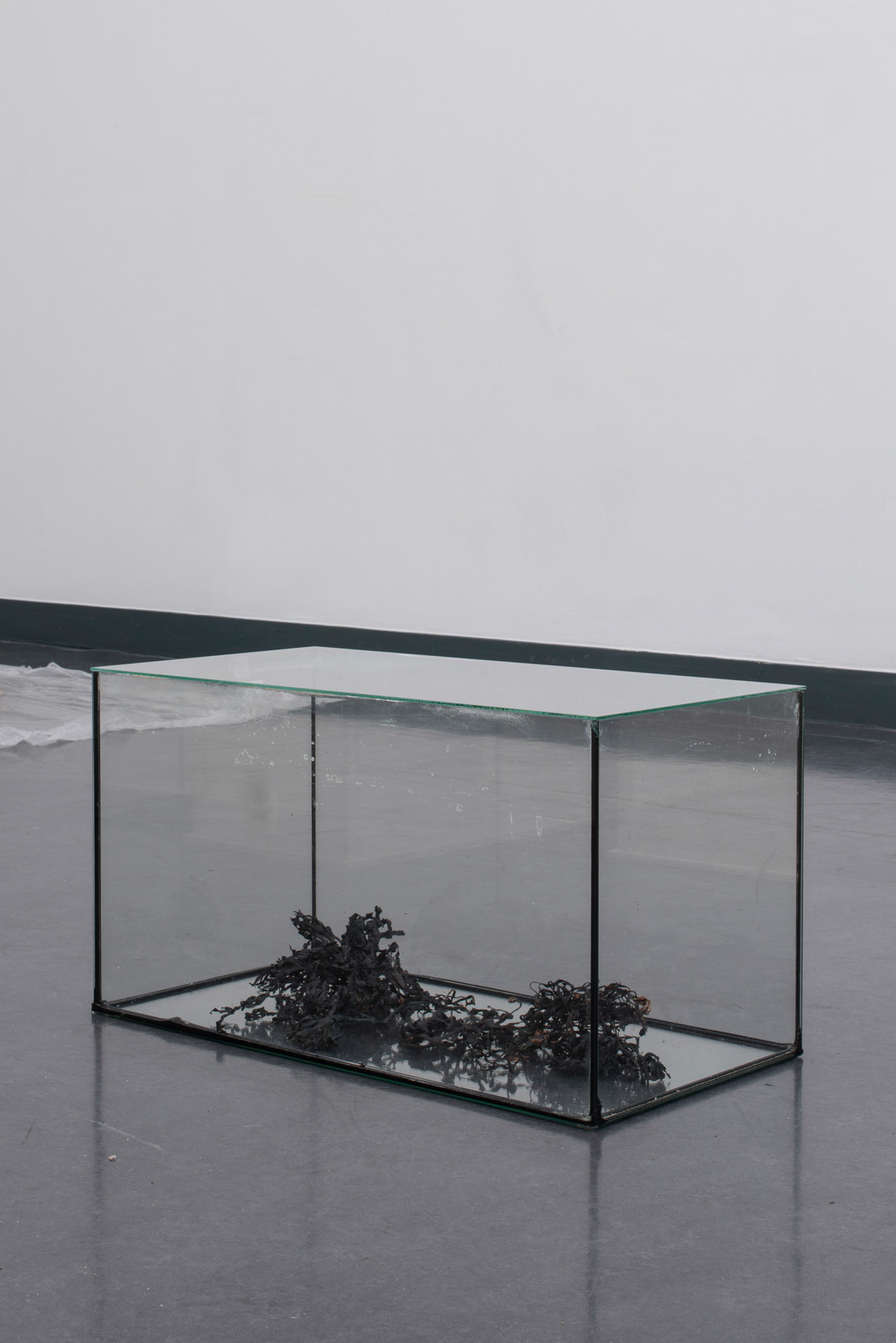 When we look through the enclosed glass capsules in her new work, we see a struggle between different powers—a performative gesture between letting go and making order. Seaweed, with its ornamental, almost archaic shapes, becomes a metaphor for memories—a body both frozen and alive, combed-out and intertwined. We might also picture the stranded seaweed as a future artifact, a perspective through which the plant becomes extinct and joins the many species sleeping in formalin. The question is: will humans be there when a plant so essential to the planet’s ecosystem, the first in the marine foodchain, vanishes? Or are humans to vanish instead, and if so will seaweed carry our interspecies cellular memory? Water molds into the shapes of aquariums, so well-known for serving people’s vision of indoor micro-utopias. Breath and steam intervene on the geometrical on-glass drawings, reminding us that the division between nature and culture is only illusory. Is it human to long for control, any more than to long for letting go?