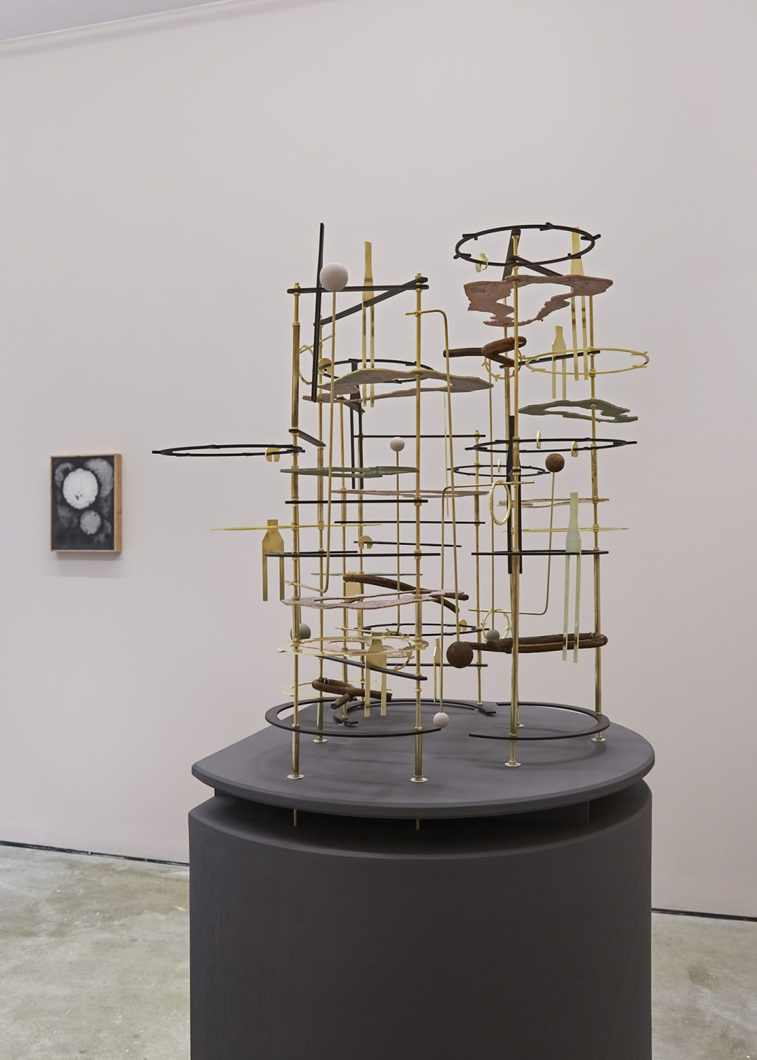 The show opens with a wall piece evoking the strata of the earth and the revelation of organic deposits. Bubbles appear like ancient gases trapped in archival ice cores, libraries of molecular information on the brink of being lost in a warming climate. Nearby, a freestanding work evokes the many interconnected networks that make up our world, from the neurological pathways of the brain to the mycorrhizal Wood Wide Web to the orbital patterns of the planets. Borrowing shapes and linearities from antique geological maps, The Right Time and Place challenges traditional modes of charting individual phenomena, suggesting a way of allowing different types of knowledge and different ways of understanding time and place within a single diagrammatical object.