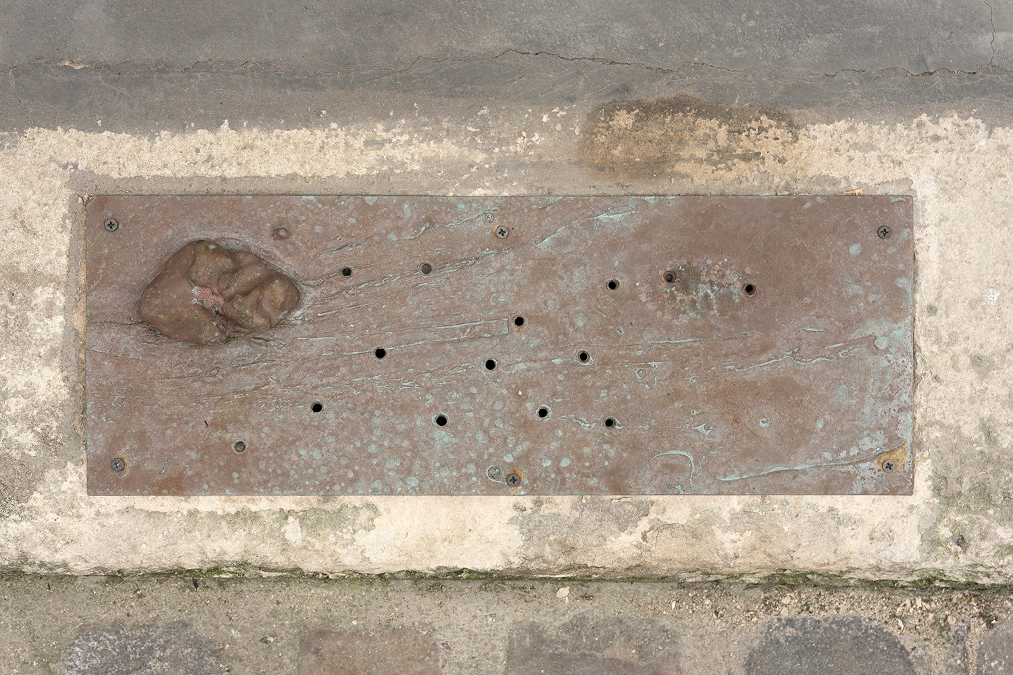 For the interior, the artist has made, in collaboration with the Rairies-Montrieux brickfactory, an ex-professo ceiling to floor brick wall system from a commercial product that uses no mortar, and has a barely visible gap permitting ventilation. Newby “carved out a home” for discarded glass shards and coins collected from friends off the streets of Paris, gluing them into place, allowing “information” to rest before firing. The vertical orientation of the piece articulates a subtle, even paradoxical relationship to what is embedded. This creates a feeling of slight disorientation due to gravity—the details on the brick wall recall chewing gum or smears on street surfaces, which we typically associate with the ground.