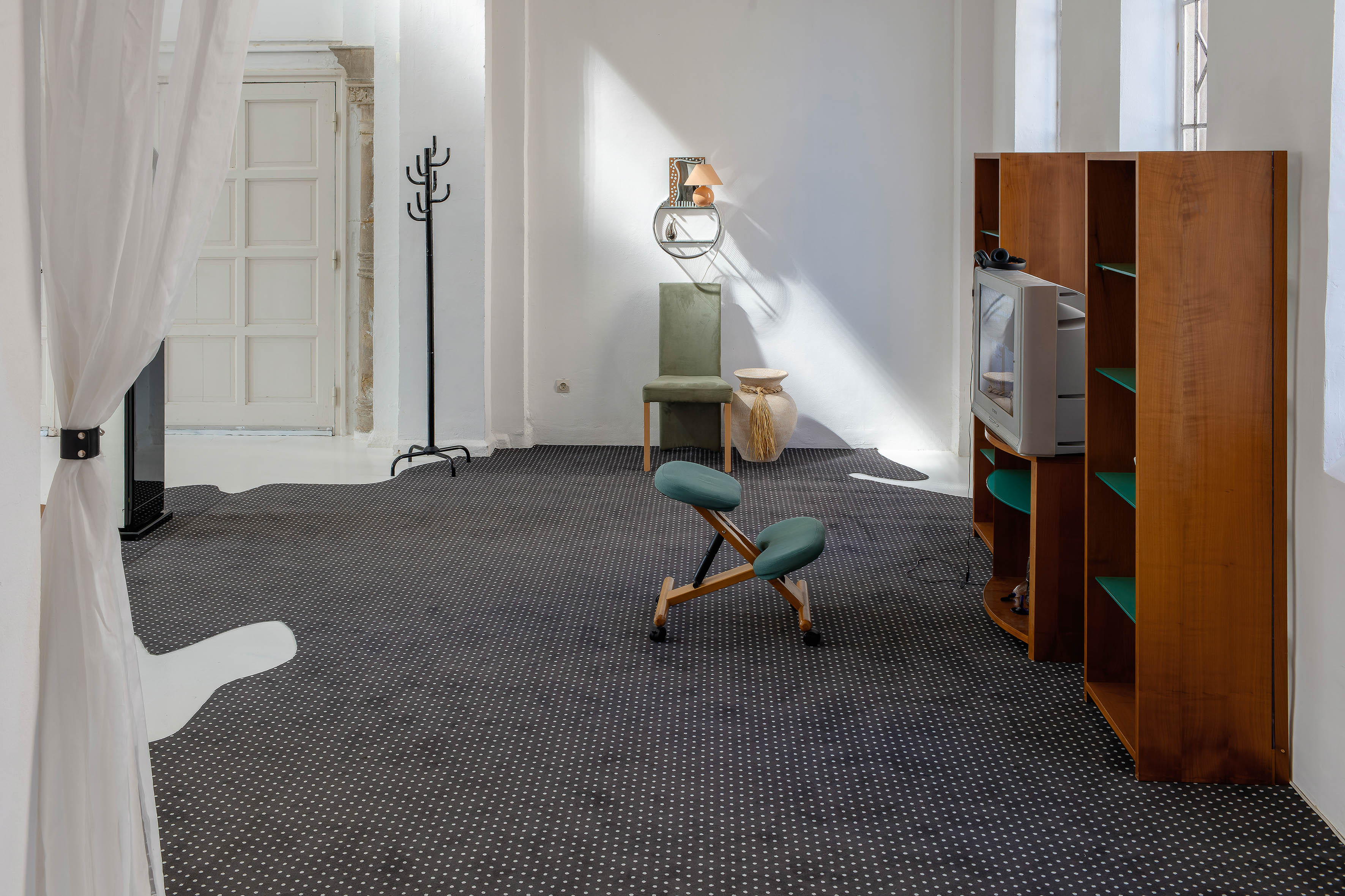On the occasion of her Westalgia exhibition at the Centre d’art contemporain – la synagogue de Delme, Henrike Naumann reactivates the installation Anschluss 90’ (2018) and adapts it to the chaotic history of the territory of Delme between 1870 and 1945, when the Moselle belonged periodically to the German Empire as it spread westwards. Anschluss 90’ was initially devised for presentation in Austria, one of the first countries annexed by Nazi Germany. Presenting a showroom from the early nineties, this work is intended as the locus of a story imagining that after the reunification of the FRG and the GDR, Austria would also have wanted to join the great Germany. But instead of military parades as in 1938, it is a proliferation of interior-design department stores and a consumerist frenzy, in both Austria and the GDR, that she sees as characterising this reunification, combining chic hedonism, kitsch consumerism, and radical nationalist politics. For its reiteration in the synagogue, the artist adds the former Gau Westmark[4]to this unifying fervour, the territory to which the Moselle belonged during the Nazi occupation from 1940 to 1945, while Delme was traversed by Adolf Hitler Straße. Shown on a carpet representing the maps of these various territories “annexed in the early 1990s”, the showroom reactivates its function of attraction and seduction on the ground floor. This “1990–2000” period room includes two video works: Triangular Stories (Terror + Amnesia) (2012), a two-channel video, presenting on one side a group of young people leaving on holiday to Ibiza to go clubbing in the early nineties and on the other, young Neo-Nazis of the same age, planning a terrorist attack. From the same generation, these characters evoke the outcast youth of the newly reunified GDR, in which the hedonism of raves could easily rub shoulders with Neo-Nazi militancy. Das Reich (2017) is an amateur-style video montage, presenting the political pretentions of the self-proclaimed “Reichsbürger” (citizens of the German Empire) party, a tiny nationalist faction that denies the legitimacy of the FRG, declaring that the German Empire is still active. Upstairs, visitors can observe these various territories from a dominant viewing platform, frozen in their shift from one country to the other, from one ideology to the other.