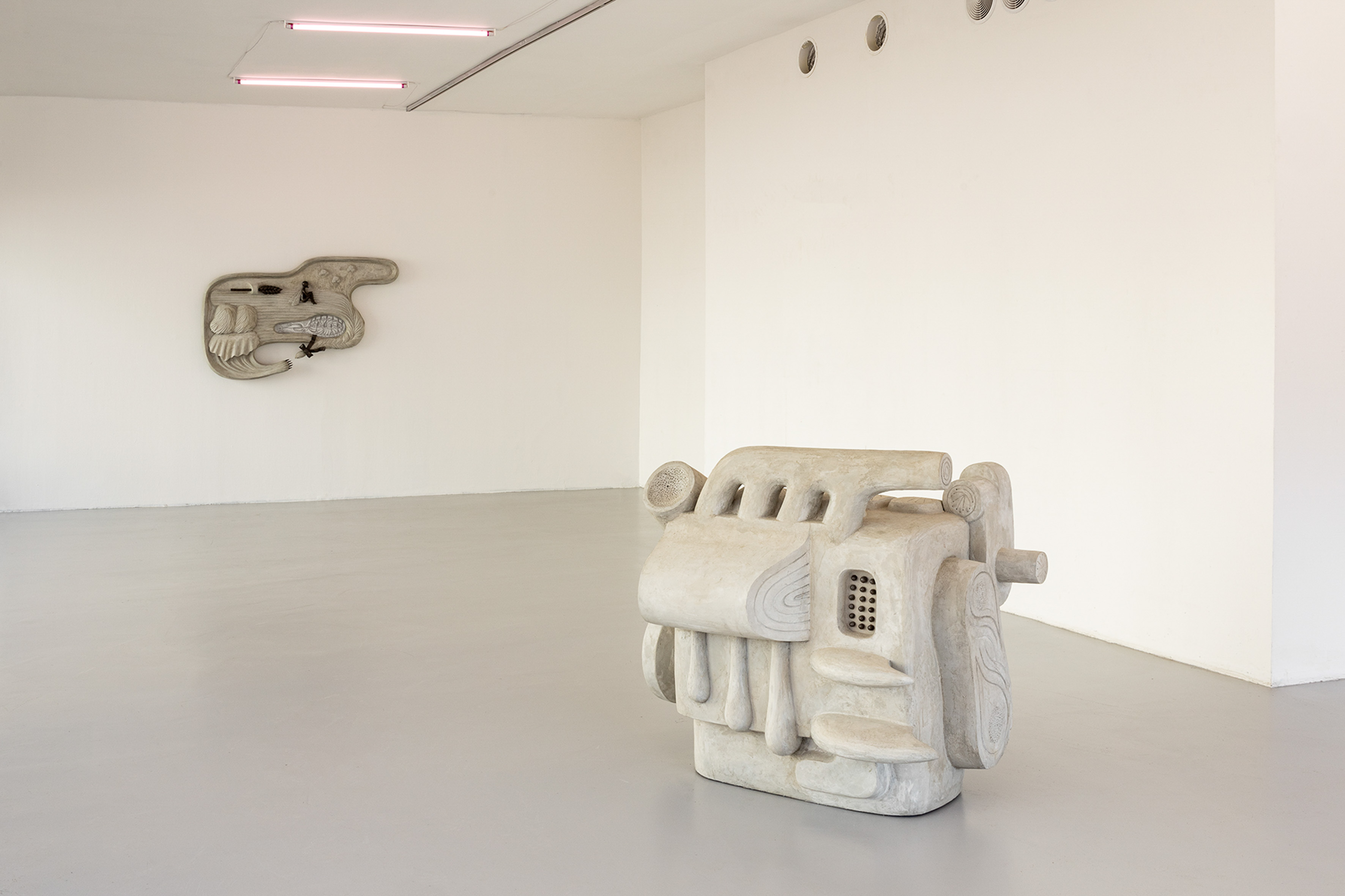Kunsthalle Bratislava is very happy to announce a new solo exhibition of the Czech sculptor Anna Hulačová, entitled Edible, Beautiful, Untamed, curated by Tjaša Pogačar. The main protagonists of the exhibition aren’t human. This is a world of modified organisms and machinery – giant vegetation, hybrid insects, and mutated agricultural equipment. Heavy concrete objects with shapes reminiscent of engines are adorned with intricate ceramic vegetal growth. Plants lean over your head, their monumental size the result of some accidental or engineered genetic modification, or – as it may well be – a humbling of a human perspective and privilege. From a fusion of the organic and technological emerges a vision of post-anthropogenic nature; a perhaps monstrous, perhaps fantastic, feral garden.
