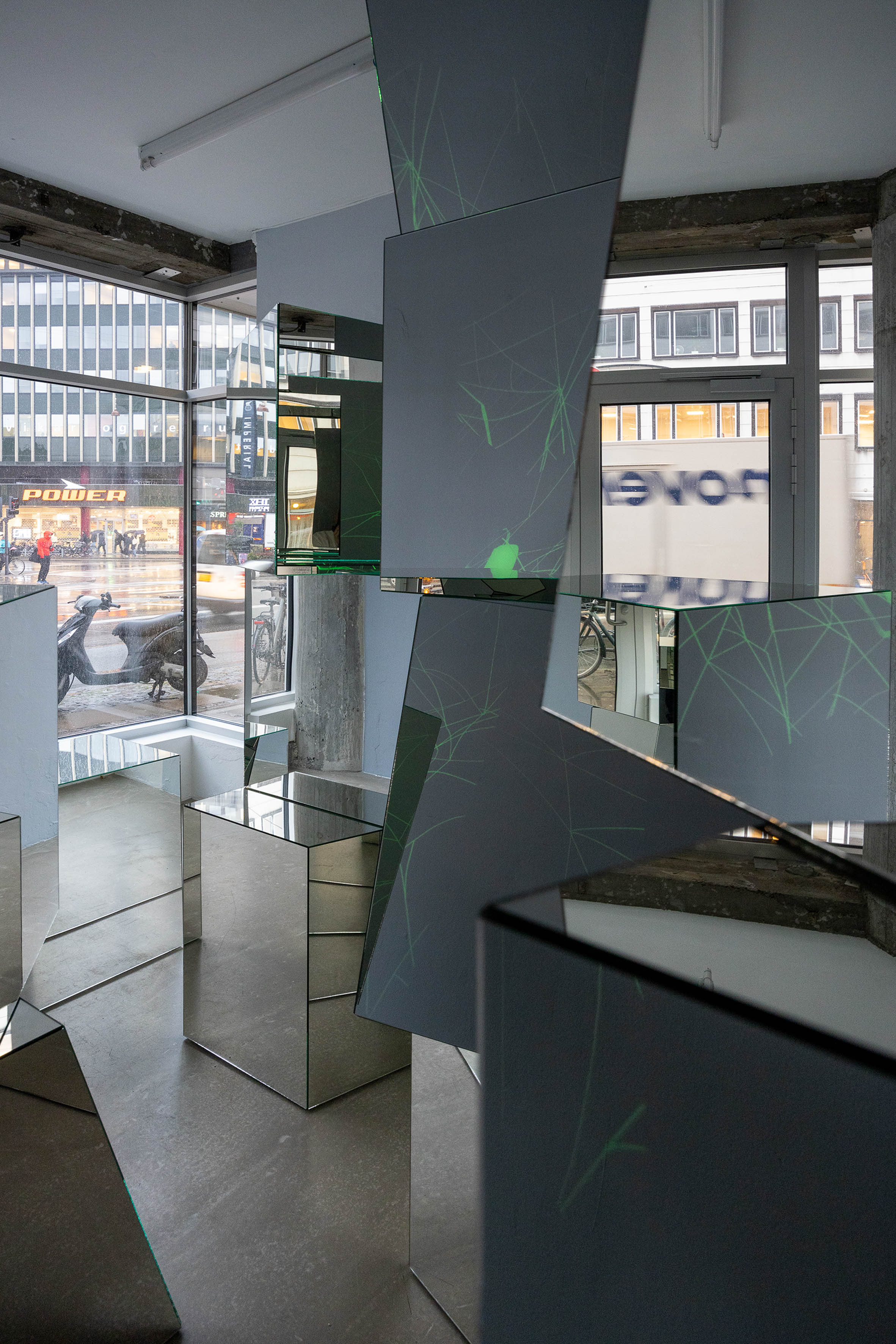 I personally love spiders, not least for how mythology equates them with female transgressions of the established order. But even for the arachnophobes among us, Lislegaard’s dazzling installation Spinning and Weaving Ada (2016) must be a wondrous space. I find it gentle, dreamy indeed. In this web woven of three and more dimensions, both digitally animated and reflected as infinitely duplicated fragments of moving images, her spiders’ glow as vivid specters. Their silent dance is formed through a software-aided analysis of the ways spiders build their webs: from a first exploration of the space of interest, to the assembly of a prototype, then a frame, now the filaments that connect the center with the edge, and finally the sticky spirals connecting and stabilizing the construction.