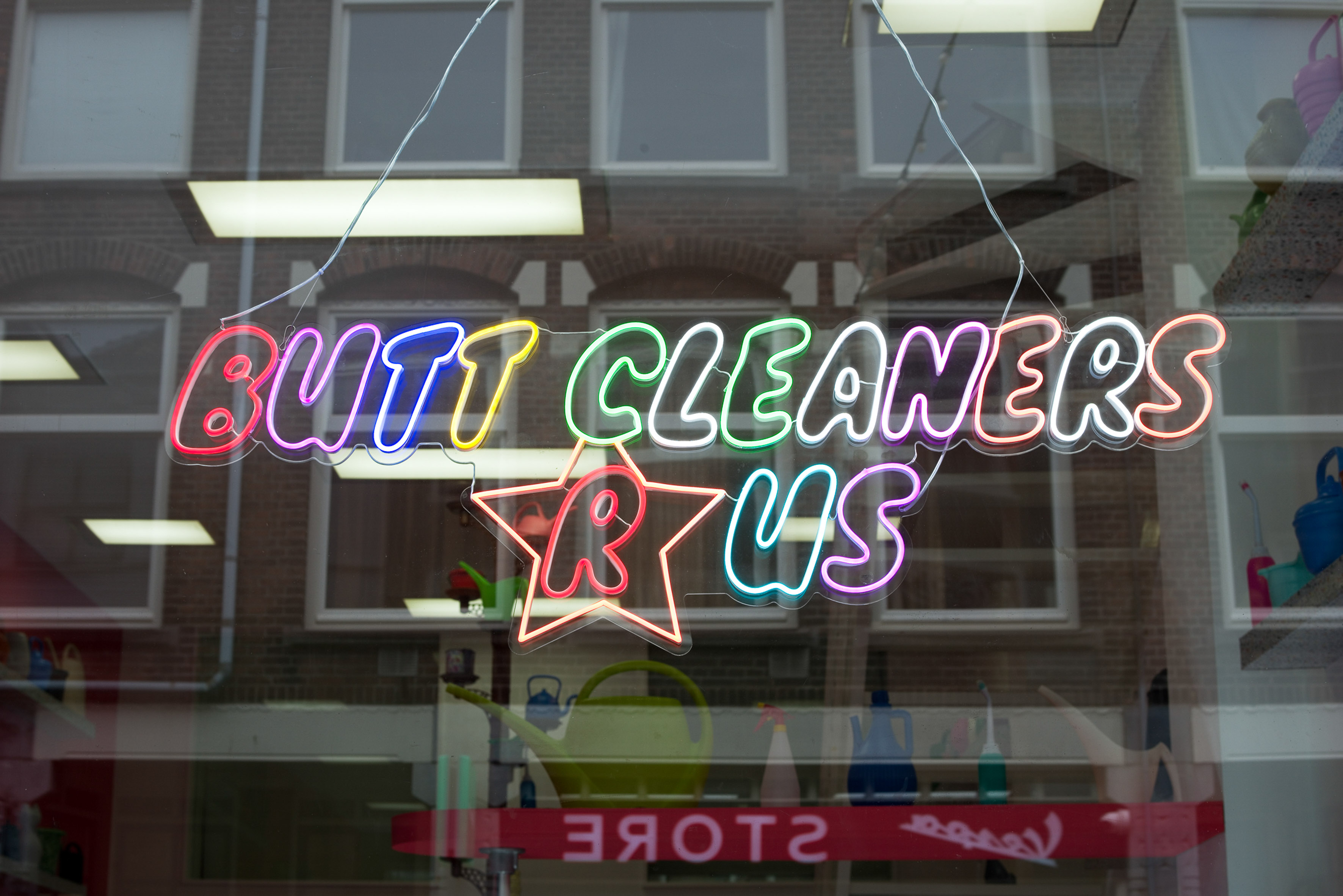 In a lively and culturally rich shopping street in the center of The Hague, a large neon sign "BUTT CLEANERS ‘R' US" welcomes the audience. The butt cleaner-filled shelves at 1646 form the setting in which Ghita Skali’s new video work is presented. The exhibition shows how what’s seen as ‘natural’ (or ‘natuurlijk’ in Dutch) is a cultural construct, carrying bias.