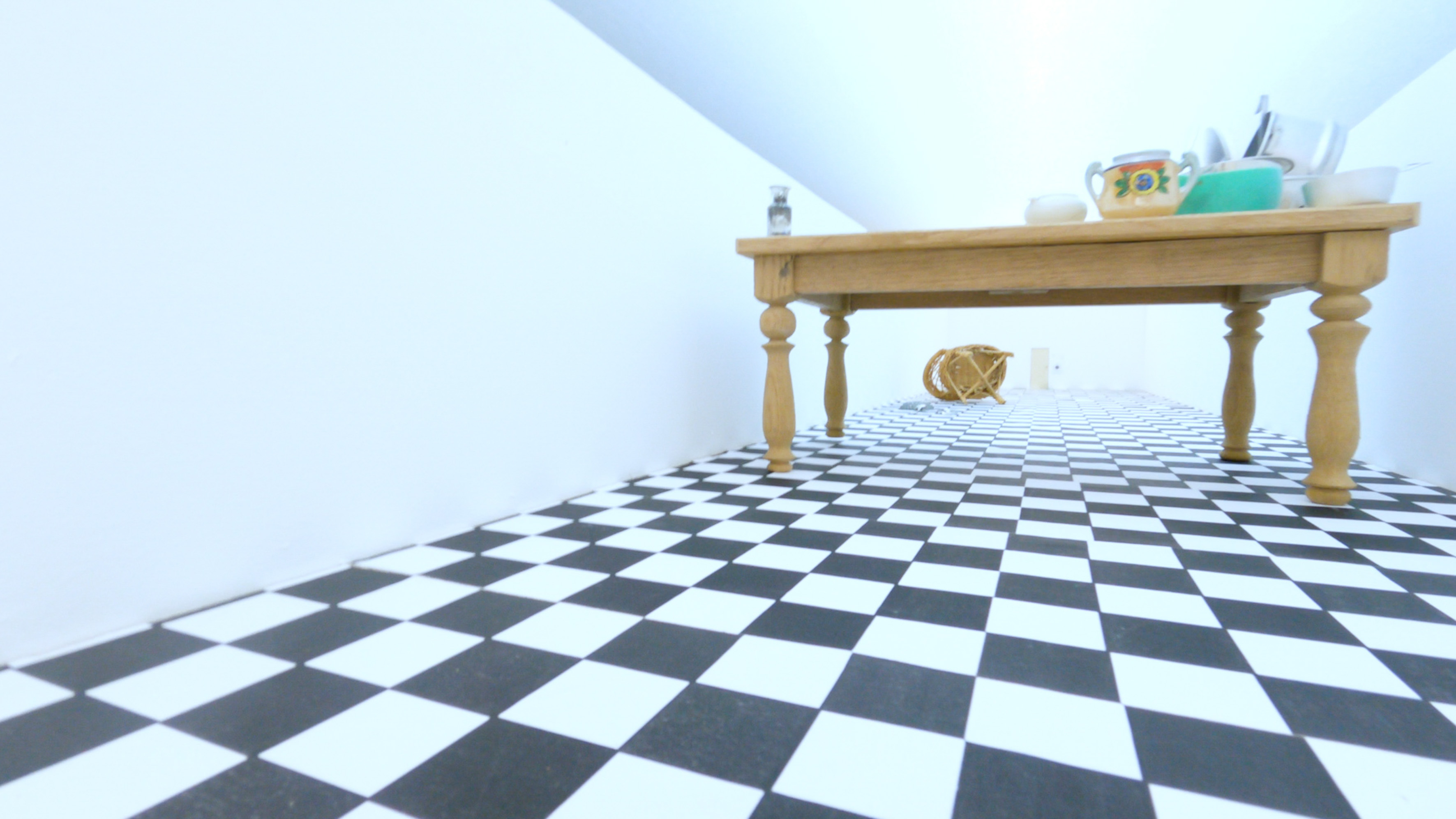 The short film Untitled (2023) projected against an old bookshelf offers us another domesticity, a homemade doll’s house, partially reconstructed. Made by the artist as a playful set during his childhood and recently found again, the readymade contains small toys and fantasy objects that might populate a fictional home. Filmed on a mini action camera that offers a first-person POV we move through doorways, curiously observing decorative features and personal belongings. Juxtaposing fact and fiction, the imagination of the past gleans into the present, speculatively forming a possible future.”