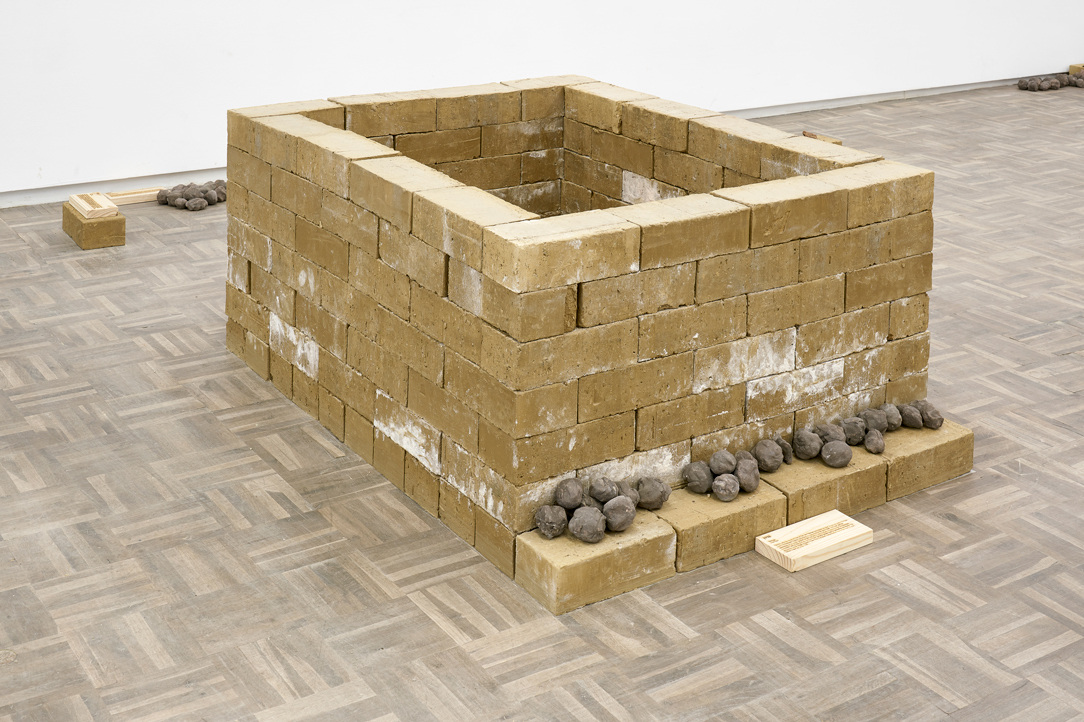 Working with carefully selected and measured quantities of soil, ash, charcoal, and other living substances, Bopape invokes the resonances of these materials to speak about the immaterial. In the sprawling Lerole: footnotes (The struggle of memory against forgetting), locally-sourced raw clay bricks are stacked in low piles throughout the space, upon which rest mounds of earth and clay impressions taken from the inside of a closed fist. Intimate embodiments of ‘self-presence’, these hand-squeezed objects also recall a gesture enacted by South African activist Robert Sobukwe who, during his banishment by the Apartheid state to Robben Island, raised a fistful of earth into the air as a show of solidarity with the newly incarcerated political prisoners.