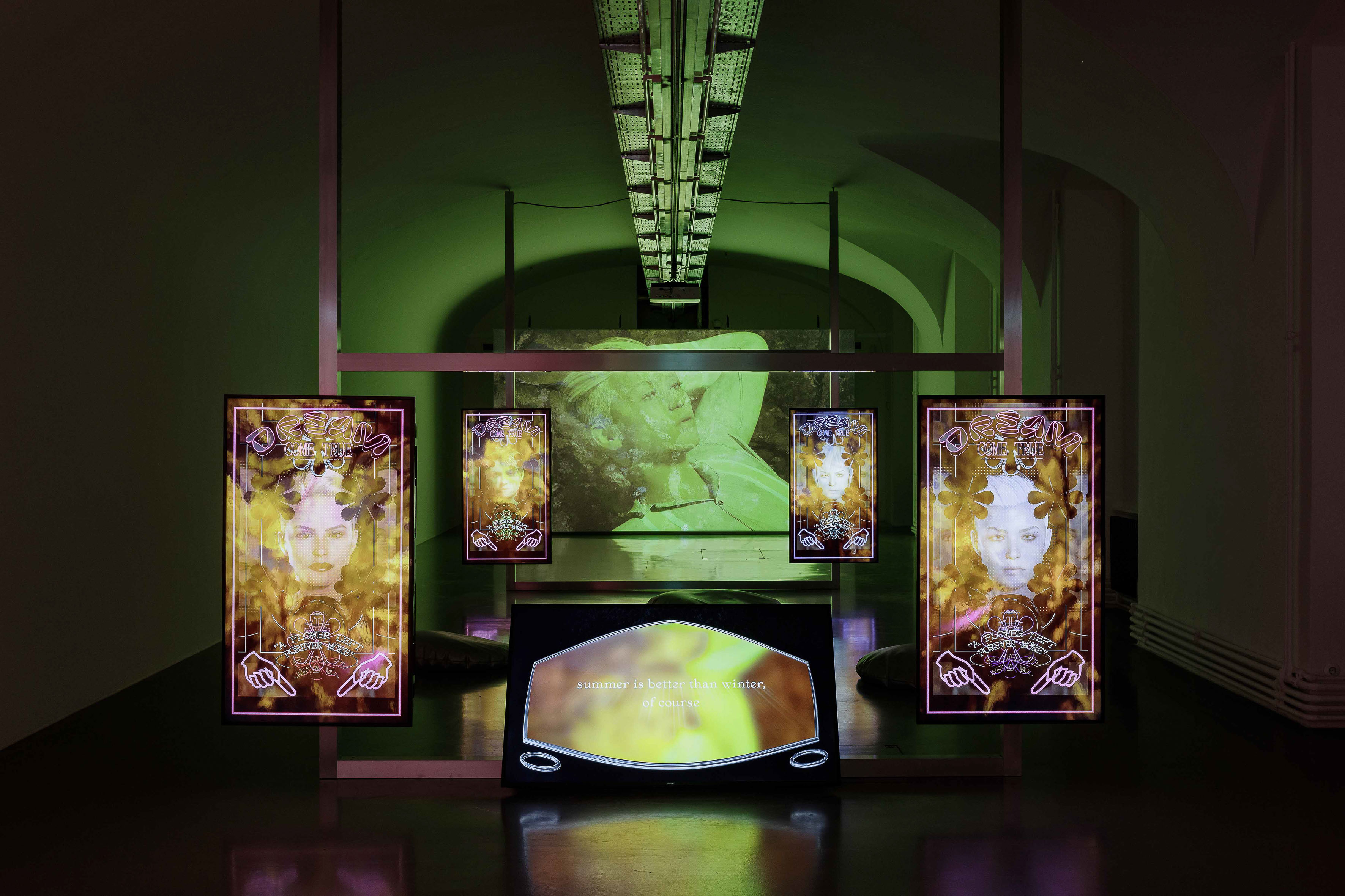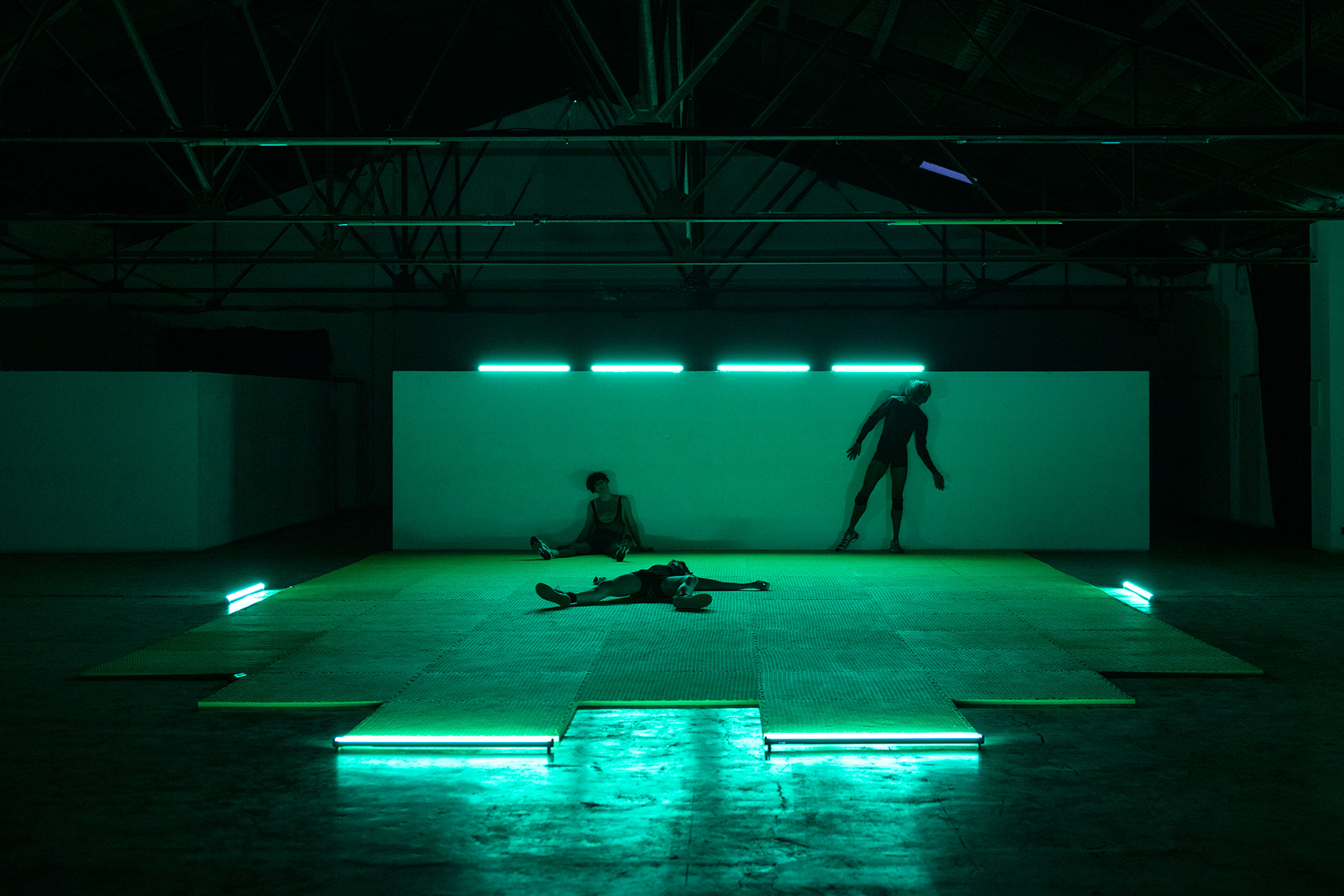 Flickering neons murmur, spreading their mellow gleaming glows. Blazing in phosphorescent hues of green, pink, blue, yellow, red and white. Permanent electric hummings colliding with slow human-like breaths and tenderness. Cold metal objects and malleable warm bodies touching gently — melting together in the haze of droning synthetic glares. Rigid, non-flexible machine-like props bending under the restless weight of human determination, softened with their hushed sigh. Flowing into intertwined technological anatomies. [...]